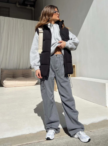 While these vests also pair well with athleisure outfits, try styling your puffer vest with some casual cargo pants, sneakers, and a hoodie for a laid-back look.
